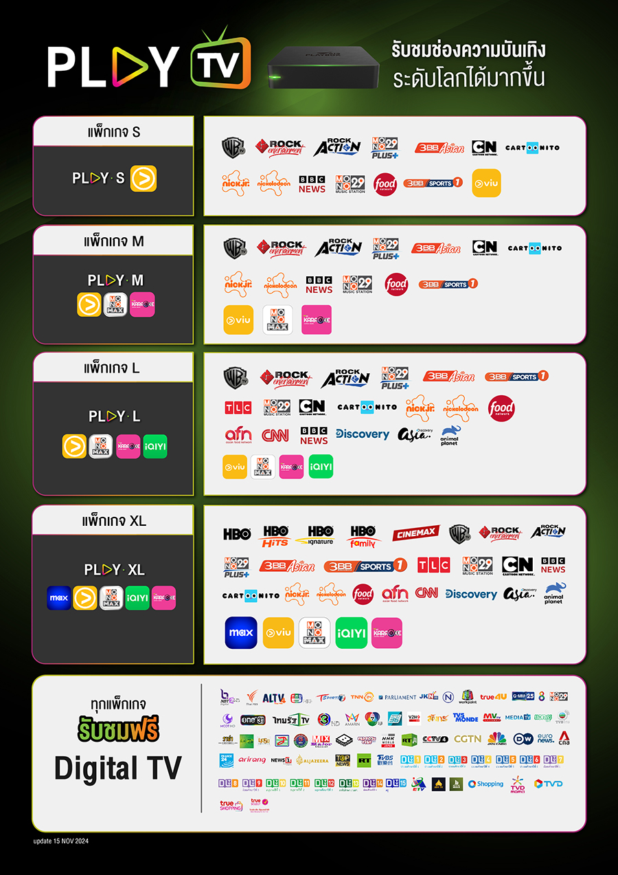 ข้อมูล ณ วันที่ 15 พฤศจิกายน 2567 ตั้งแต่ 15 มี.ค. 67 เป็นต้นไป แพ็กเกจ PLAY L และ PLAY XL จะเพิ่มแอปความบันเทิง iQIYI มาทดแทน 3Plus ที่รับชมได้ถึง 14 มี.ค. 67
